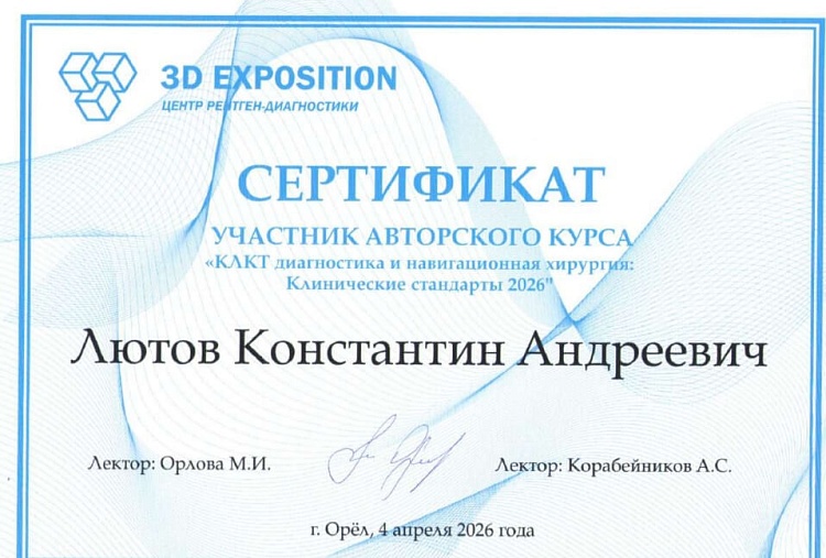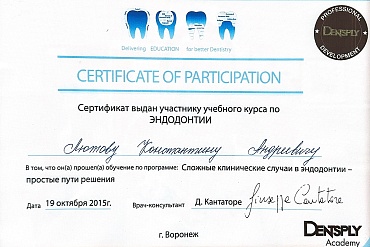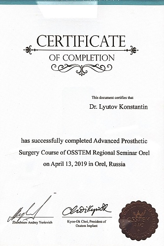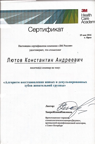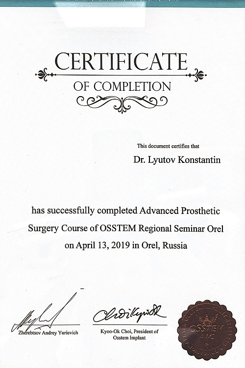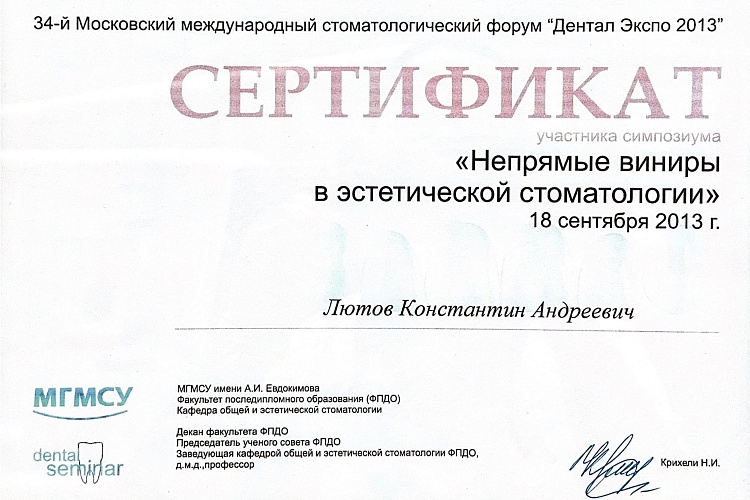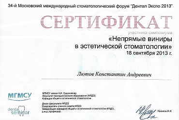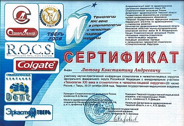 2012Профессиональная переподготовка - государственное бюджетное образовательное учреждение высшего профессионального образования «Тверская государственная медицинская академия» Министерства здравоохранения Российской Федерации, 12.12.2012, ПП-3/002719, Стоматология ортопедическая.