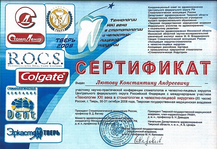 2011Государственное образовательное учреждение высшего профессионального образования «Тверская государственная медицинская академия» Министерства здравоохранения и социального развития Российской Федерации , 17.06.2011, К/37772 Врач-стоматолог.