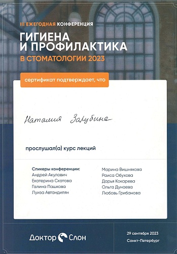 Квалифицированный гигиенист стоматологический с многолетним опытом работы более 10 лет. Специализируется на проведении профессиональной гигиены полости рта, удаляет зубной камень и пигментированный налет с применением современных технологий. Оказывает индивидуальные консультации по подбору средств гигиены и профилактике стоматологических заболеваний, обеспечивая пациентам здоровье зубов и эстетику улыбки. Владеет современными методиками отбеливания (ZOOM 4, лазерное отбеливание) и устранения дисколоритов.