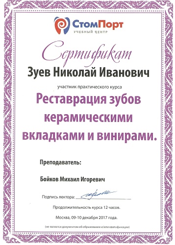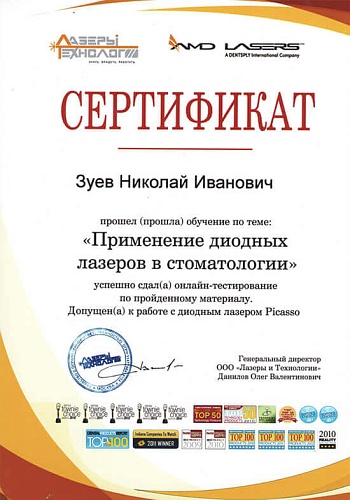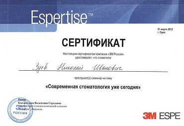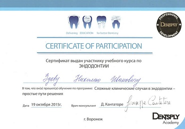 2013Профессиональная переподготовка – государственное бюджетное образовательное учреждение высшего профессионального образования «Курский государственный медицинский университет» Министерства здравоохранения Российской Федерации», 23.05.2013, ПП-3/065770, Стоматология терапевтическая.