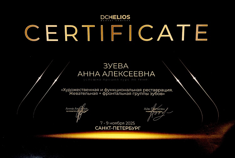 2013Профессиональная переподготовка – государственное бюджетное образовательное учреждение высшего профессионального образования «Курский государственный медицинский университет» Министерства здравоохранения Российской Федерации», 23.05.2013, ПП-3/065769, Стоматология терапевтическая.
