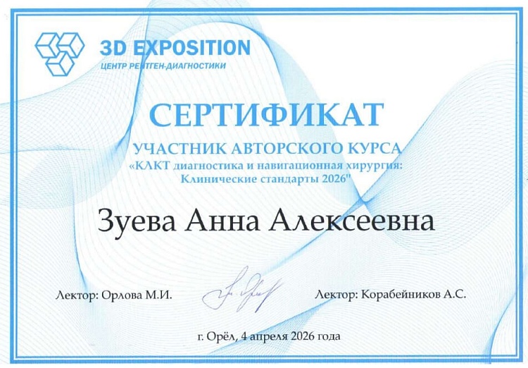 - Проведение осмотра и диагностики стоматологических заболеваний, составление плана лечения с использованием современных методик (визиография, КЛКТ, внутриротовая камера)
